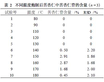 2. 1. 9 樣品測定 按2. 1. 3項下供試品溶液的制備方法,對各批苦杏仁中苦杏仁苷的含量進行測定. 2. 2 炮制方法 取凈苦杏仁置于電熱干燥箱中,在設(shè)定條件下烘制,取出,放涼. 2. 3 影響因素的優(yōu)選 2. 3. 1 溫度對苦杏仁中苦杏仁苷含量的影響取苦杏仁100 g,平行3份. 分別于80, 90, 100, 110, 120, 130, 140, 150, 160, 170, 180 ℃烘制1 h,測定苦杏仁苷的含量,結(jié)果見表2.