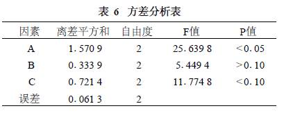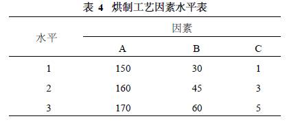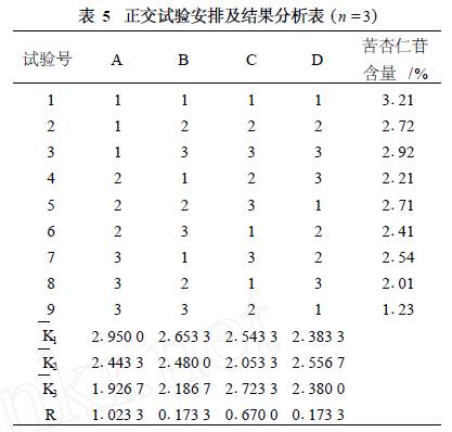 由表3可以看出30~60 min具有較好的烘制效果. 2. 4 正交試驗及方差分析 以烘制時間、烘制溫度和物料厚度為考察因素,每個因素擬定3個水平,設(shè)計正交試驗(見表4). 2. 4. 1 正交試驗設(shè)計及結(jié)果 利用L9 (34)正交表安排試驗(見表5) ,以苦杏仁苷(C20H27NO11 )含量為指標,確定最佳炮制工藝.(試驗結(jié)果見表5,方差分析結(jié)果見表6)