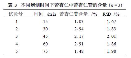 由表2可見, 150~170 ℃時具有較好的烘制效果,低于130 ℃時苦杏仁苷被完全酶解. 2. 3. 2 時間對苦杏仁中苦杏仁苷含量的影響取苦杏仁100 g,平行3份. 在150 ℃分別烘制 15, 30, 45, 60, 75 min取樣,測定苦杏仁苷的含量,結(jié)果見表3.