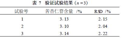 從正交表和方差分析表可以得出,影響苦杏仁苷含量因素的主次順序為A > C > B,最佳工藝為A1B1 C3 ,即物料厚度為5 cm,在150 ℃下烘制30min,取出. 2. 4. 2 炮制工藝驗證 取苦杏仁100 g,平行3份,物料厚度為5 cm,150 ℃烘制30 min,取出. 結(jié)果見表7. 由表7可以看出,恒溫烘烤苦杏仁的炮制工藝穩(wěn)定可行. 3 討論 本試驗選擇了索氏提取法、回流提取法、超聲提取法3種方法進行了對比考察,結(jié)果表明超