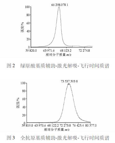 2 結果 2.1。茫牵联玻拢樱寥斯た乖模停粒蹋模瑟玻裕希篇玻停予b定圖2和圖3分別為BSA和CGABSA的質譜圖?芍拢樱恋南鄬Ψ肿淤|量為66298,CGABSA 的相對分子質量為73538,已知CGA的相對分子質量為354,該結果表明CGABSA中,每個載體蛋白BSA分子上偶聯(lián)有20個[(73538-66298)/354≈20]CGA分子,人工抗原的合成成功可用于進行相應的變態(tài)反應基礎研究。