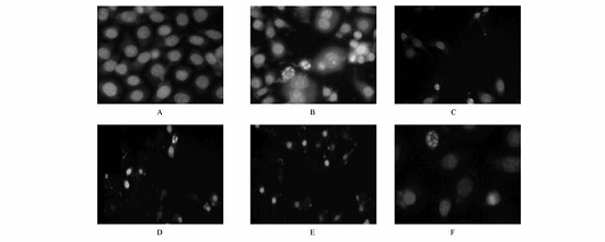 A對照組;B楊梅樹皮素40mg·L-1;C楊梅樹皮素60mg·L-1;D楊梅樹皮素80mg·L-1; E楊梅樹皮素100mg·L-1;F陽性對照組。 圖1 熒光顯微鏡觀察楊梅樹皮素對HepG2細(xì)胞形態(tài)學(xué)改變的影響 A
