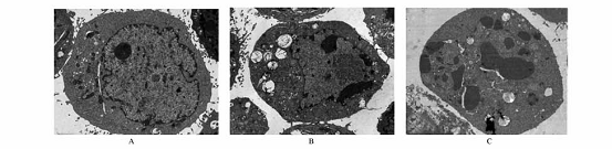 A對照組;B楊梅樹皮素60mg·L-1;C楊梅樹皮素100mg·L-1。 圖2 電子透射電鏡觀察楊梅樹皮素對HepG2細(xì)胞形態(tài)學(xué)改變的影響(×6000