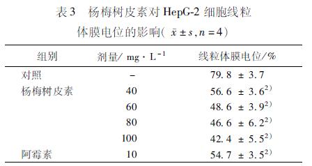 34 楊梅樹皮素對HepG2細(xì)胞線粒體膜電位的影響 細(xì)胞經(jīng)羅丹明123染色,流式細(xì)胞儀檢測,結(jié)果顯示經(jīng)不同濃度MYR作用后的HepG2細(xì)胞與空白對照組相比(空白組的熒光強(qiáng)度為798%)線粒體膜電位顯著降低。各劑量組的熒光強(qiáng)度分別為566%,486%,466%,424%,陽性對照組(阿霉素10mg·L-1)的熒光強(qiáng)度為547%(表3)。