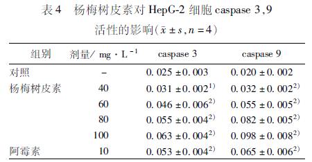 35 楊梅樹皮素對HepG2細(xì)胞caspase3,9活性的影響 經(jīng)不同濃度MYR作用后的HepG2細(xì)胞中caspase3,9活性增加。正常情況下caspase3,9活性水平較低,A405值分別為0025和0020,在MYR作用下,其活性升高,A405分別升至為0031,0046,0055,0063和0032,0056,0083,0098,與空白對照組相比,差異有統(tǒng)計(jì)學(xué)意義(P<005)(表4)。 4 討論 近年來,尋找有效的抗腫瘤天然藥物成為研究的熱點(diǎn)之一,許多文獻(xiàn)[910]報(bào)道楊梅素對多種腫瘤具有殺傷作用,在臨床上用于治療食管腺癌、結(jié)腸癌等多種癌癥。體外實(shí)驗(yàn)研究表明MYR對HepG2細(xì)胞有明顯的抑制作用,且存在劑量效應(yīng)關(guān)系;通過光鏡、電鏡形態(tài)學(xué)觀察,可見胞體縮小,胞漿凝縮,核內(nèi)染色質(zhì)從均勻分布逐漸凝集成新月狀,附