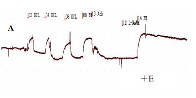 1.1 設(shè)備 離體血管環(huán)灌流裝置,JZJ01 型肌肉張力換能器,HSS -1B 型數(shù)字式超級恒溫浴槽,RM6240B 型多道生理信號采集處理系統(tǒng),均為成都儀器廠產(chǎn)品。 1.2 藥物與試劑 苯腎上腺素(Phenylephrine ,PE),乙酰膽堿(Acetylcholine,Ach),左旋硝基精氨酸甲脂(N (omega )-nitro-L-methyl-ester ,L-NAME ),吲哚美辛(Indomethacin ,Indo ),1H-[1,2,4]oxadiazolo[4,3-alpha]quinoxalin-1-one (ODQ) ,格列苯脲(Glibenclamide ),以上均為Sigma公司產(chǎn)品,杜仲皮水提取物由浙江大學藥學院提取,用K-H 液配制含杜仲提取物20mg/ml 的原液。Krebs-Henseleit(K-H )液(mmol/L):NaCL 118、KCL 4.7、KH2 PO4 1.2 、MgSO4 •7H2O 1.2、NaHCO3 25,glucose 10、CaCL2 1.25 。 1.3 血管環(huán)的制備 Sprague-Dawley (SD)大鼠,雄性,體重 200 -280 g,由浙江大學醫(yī)學院動物實驗中心提供。每個大鼠的胸主動脈被分成 6 段,并隨機分入6 個實驗組進行平行研究。 具體方法為:用鈍器擊昏大鼠后充分放血,迅速取胸主動脈,置于通以95%O2 和5 %CO2 混合氣體預飽和地4°C K-H液中,去除周圍結(jié)締組織后將血管剪成約3~4mm的血管環(huán),避免過度牽拉,以防損傷內(nèi)皮。根據(jù)實驗需要,去除血管內(nèi)皮時,用鑷子磨擦血管環(huán)內(nèi)表面以去除內(nèi)皮細胞。將血管環(huán)懸掛于預置10ml K-H液的浴槽內(nèi),37°C恒溫,持續(xù)通以95%O2 和5 %CO2 的混合氣體。靜息張力0g穩(wěn)定血管30min,每隔15min 換一次K-H 液,此后調(diào)節(jié)靜息張力為2g,穩(wěn)定穩(wěn)定1h,期間每隔15min 換一次K-H液。用3M的KCL 重復刺激3 次,以誘發(fā)血管的最大收縮幅度。待血管穩(wěn)定后,用10-4 mol/L PE預收縮血管環(huán)達峰值,加入10-3 mol/L Ach檢驗內(nèi)皮的完整性。加入Ach后使PE預收縮的血管環(huán)舒張60%~90%,認為內(nèi)皮完整,反之,認為內(nèi)皮被破壞。 實驗用RM6240B型生物信號采集處理系統(tǒng)記錄血管張力的變化,分別以末次 KCL(終濃度 6×10-2 mol/L)、PE(終濃度10-8 mol/L)刺激引起的最大收縮幅度為標準,以加入藥物后的血管張力幅度與之相比所得百分比比值表示。 1.4 實驗分組 1.4.1 累積濃度杜仲水提取液對 PE預收縮內(nèi)皮完整的血管環(huán)的作用(有內(nèi)皮組):實驗組(n =7),用PE(10-4mol/L)預收縮血管,達穩(wěn)定后用累積加藥法,以每 15min 加杜仲水提取液一次,使灌流液中的杜仲提取物終濃度分別達0.2、0.4、0.8、1.6、2.4、3.2(mg/mL ),觀察杜仲提取物對對PE 預收縮內(nèi)皮完整的血管環(huán)的作用。 1.4.2 累積濃度杜仲水提取液對 PE預收縮去內(nèi)皮的血管環(huán)的作用(去內(nèi)皮組):實驗組(n =7),用PE(10-4mol/L)預收縮血管,達穩(wěn)定后用累積加藥法,以每 15min 加杜仲水提取液一次,使灌流液中的杜仲提取物終濃度分別達0.2、0.4、0.8、1.6、2.4、3.2(mg/mL ),觀察杜仲提取物對 PE預收縮去除內(nèi)皮的血管環(huán)的作用。 1.4.3 累積濃度杜仲水提取液對 KCL 預收縮內(nèi)皮完整的血管環(huán)的作用(KCL 組):實驗組(n =6),用KCL (60mmol/L)預收縮血管,達穩(wěn)定后用累積加藥法,以每 15min 加杜仲水提取液一次,使灌流液中的杜仲提取物終濃度分別達0.2、0.4、0.8、1.6、2.4、3.2(mg/mL ),觀察杜仲提取物對KCL預收縮內(nèi)皮完整的血管環(huán)的作用。 1.4.4 L-NAME 對杜仲誰提取物作用影響組(L-NAME 組):實驗組(n =8),內(nèi)皮完整的血管環(huán)用10-4mol/L L-NAME 預處理15min 后,再用 PE(10-4mol/L)預收縮血管,達穩(wěn)定后用累積加藥法,以每15min 加杜仲水提取液一次,使灌流液中的杜仲提取物終濃度分別達0.2、0.4、0.8、1.6、2.4、3.2(mg/mL ),觀察 L-NAME 預處理后杜仲提取物對PE預收縮內(nèi)皮完整的血管環(huán)的作用。 1.4.5 Indo 對杜仲誰提取物作用影響組(Indo 組):實驗組(n =6),內(nèi)皮完整的血管環(huán)用 10-5mol/L Indo預處理15min 后,再用PE(10-4mol/L)預收縮血管,達穩(wěn)定后用累積加藥法,以每 15min 加杜仲水提取液一次,使灌流液中的杜仲提取物終濃度分別達0.2、0.4、0.8、1.6、2.4、3.2(mg/mL ),觀察 Indo預處理后杜仲提取物對PE預收縮內(nèi)皮完整的血管環(huán)的作用。 1.4.6 格列苯脲(Glib )對杜仲誰提取物作用影響組(格列苯脲組):實驗組(n =6),內(nèi)皮完整的血管環(huán)用3µmol/L 格列苯脲預處理 15min 后,再用PE(10-4mol/L)預收縮血管,達穩(wěn)定后用累積加藥法,以每15min 加杜仲水提取液一次,使灌流液中的杜仲提取物終濃度分別達0.2、0.4、0.8、1.6、2.4、3.2(mg/mL ),觀察格列苯脲預處理后杜仲提取物對PE預收縮內(nèi)皮完整的血管環(huán)的作用。 1.4.7 ODQ 對杜仲誰提取物作用影響組(ODQ組):實驗組(n =7 ),內(nèi)皮完整的血管環(huán)用10µmol/LODQ預處理15min 后,再用PE(10-4mol/L)預收縮血管,達穩(wěn)定后用累積加藥法,以每15min加杜仲水提取液一次,使灌流液中的杜仲提取物終濃度分別達0.2、0.4、0.8、1.6、2.4、3.2(mg/mL ),觀察ODQ預處理后杜仲提取物對PE預收縮內(nèi)皮完整的血管環(huán)的作用。 1.4.8 4-AP 對杜仲誰提取物作用影響組(4-AP組):實驗組(n =6 ),內(nèi)皮完整的血管環(huán)用1mmol/L4-AP 預處理15min 后,再用PE(10-4mol/L)預收縮血管,達穩(wěn)定后用累積加藥法,以每15min加杜仲水提取液一次,使灌流液中的杜仲提取物終濃度分別達0.2、0.4、0.8、1.6、2.4、3.2(mg/mL ),觀察4-AP預處理后杜仲提取物對PE預收縮內(nèi)皮完整的血管環(huán)的作用。 1.4.9 TEA 對杜仲誰提取物作用影響組(TEA 組):實驗組(n =5),內(nèi)皮完整的血管環(huán)用1mmol/L4-