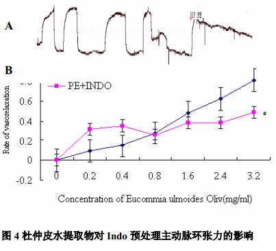 Fig 3. Effect of Eucommia ulmoides Oliv on tension of phenylephrine(PE) precontracted aorta rings of rat which have been pretreated by L-NAME. A: Records from experiments illustrating the effect of Eucommia ulmoides Oliv on the phenylephrine(PE) precontracted tension of aorta rings of rat which have been pretreated by L-NAME. B: Pooled data of mean normalized vessel tension obtained form PE precontracted aorta rings(pretreated by L-NAME) with endothelium. ##p <0.01 compared with predrug value (concentration 0),#p<0.05 compare PE (+E )group with L-NAME +PE(+E )group. 2.4 杜仲皮水提取物對 PE預收縮Indo 處理的主動脈環(huán)張力的影響 為了探討環(huán)氧合酶(COX)途徑是否參與杜仲皮水提取物的血管舒張作用,采用內(nèi)皮完整的血管環(huán)用環(huán)氧合酶抑制劑Indo 處理后,觀察杜仲皮水提取物對血管張力的影響。Indo 預處理后,杜仲皮水提取物對PE預收縮的血管產(chǎn)生的舒張作用被減弱(#p <0.05 ),但 Indo 處理自身對 PE誘導的血管張力無明顯影響(圖4 )。