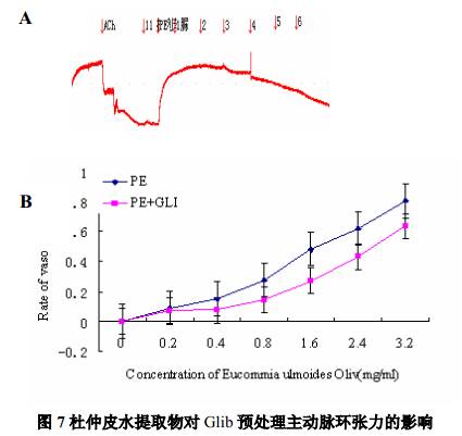 References: [1] 胡佳玲.杜仲研究進展.中草藥,1999,30(5):394-396 [2] 胡世林.國外研究杜仲的某些進展與動向.國外醫(yī)學中醫(yī)中藥分冊,16 (5 ):13,14 [3] 郝武富,中國中藥研究,1996,21(7 ):411 [4] Chiu-Yin Kwan et. al. Endothelium-dependent vasorelaxant effects of the aqueous extracts of the Eucommia ulmoides Oliv. leaf and bark: implications on their antihypertensive action. Vascular Pharmacology 40 (2004) : 229– 235 [5] 曹春梅,葉松,俞虎,等,白細胞介素!" 引起離體大鼠主動脈環(huán)舒張及其作用機制,生理學報,2003,55(1 ):19 -23 [6] 張必祺,胡申江,單綺嫻,等,JOURNAL OF ZHEJIANG UNIVERSITY (MEDICAL SIENCES)(浙江大學學報(醫(yī)學版))2005 ,34(1 ):68 [7] Moncada S ,Palmer RM ,Higgs EA,Nitric oxide:physiology,pathophysiology ,and pharmacology. Pharmacol Rev 1991;43 ;109-142 [8] Furchgott RF ,Vanhoutte PM ,Endothelium-dependent factors,F(xiàn)ASEB,1989;3 ;2007 -2018 [9] 朱妙章等,心血管生理學與臨床,北京:高等教育出版社,2004:263-265,274 ,282-285 [10] Changhua Wang et al ,Decreased aortic smooth muscle contraction in a rat model of multibacterial sepsis,Blackwell Publishing Fundamental & Clinical Pharmacology 18 (2004) 679–683 [11] 楊世杰等,藥理學,北京:人民衛(wèi)生出版社,2003:272 ,273 [12] 韋耿澤,朱運龍,于軍,等,17-β雌二醇對大鼠胸主動脈的舒張作用及其機制的研究,醫(yī)學研究生學報,2003:16(12),896 [13] Mendelsohn MF ,Abras RH,The protectiv effects of estrogen on the cardiovascular system[J] ,N Engl J Med 1999:340(23),1801 -1811 [14] Linoln TM,Dey N,Sellak H,cGMP-dependent protein kinase signaling mechanisms in smootn muscle from the regulation of tone to gene expression[J] ,J Appl Physiol ,2001:91(3 ),1421-1430