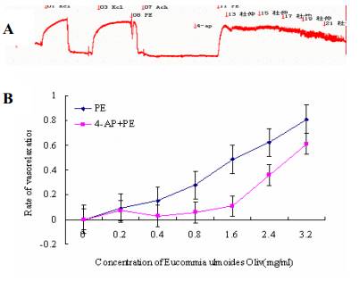 Fig. 7 Effect of Eucommia ulmoides Oliv on tension of phenylephrine(PE) precontracted aorta rings of rat which have been pretreated by Glib A: Records from experiments illustrating the effect of Eucommia ulmoides Oliv on the phenylephrine(PE) precontracted tension of aorta rings of rat which have been pretreated by Glib. B: Pooled data of mean normalized vessel tension obtained form PE precontracted aorta rings(pretreated by Glib with endothelium. 2.8 杜仲皮水提取物對 PE預收縮4-PA處理的主動脈環(huán)張力的影響 為了研究杜仲皮水提取物的血管舒張作用是否通過電壓門控K+通道發(fā)揮作用,用電壓門控 K+通道阻斷劑4-AP 處理內(nèi)皮完整的血管環(huán)后,觀察杜仲皮水提取物的血管效應。4-AP處理后,杜仲皮水提取物對PE預收縮血管的舒張作用未被明顯減弱(p >0.05),且 4-aminopyridine(4-AP)處理自身對PE誘導的血管張力無明顯影響。