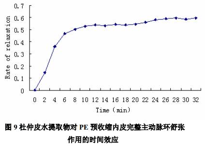 Fig.8 The time dependent effect of Eucommia ulmoides Oliv on tension of phenylephrine(PE) precontracted aorta rings of rat. 3 討論