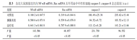 大黃素對大鼠急性胰腺炎的治療作用 【摘要】 目的 探討大黃素誘導(dǎo)細胞凋亡對大鼠急性胰腺炎(acutepancreatitis,AP)的治療作用。 方法。矗抵唬樱拇笫蠓譃閷φ战M、胰腺炎組、治療組,每組15只。觀察胰腺組織內(nèi)腺泡細胞凋亡指數(shù)、NFκBmRNA、BaxmRNA、外周血中中性粒細胞(polymorphonuclearneutrophil,PMN)凋亡指數(shù)及天冬氨酸特 異性半胱氨酸蛋白酶(caspase3、caspase8)的變化情況。結(jié)果 與胰腺炎組比較,治療組腺泡細胞和PMN 凋亡指數(shù)及胰腺組織內(nèi)NFκBmRNA、BaxmRNA、PMNcaspase3與caspase8表達均明顯增加(F=853.199, 327.126,143.586,48.857,231.750,96.552,P<0.05)。治療組中,胰腺組織病理學(xué)評分與胰腺腺泡細胞 凋亡指數(shù)、PMN凋亡指數(shù)均呈負相關(guān)(r=-0.96,-0.94,P<0.05);胰腺腺泡細胞凋亡指數(shù)與胰腺組織 內(nèi)NFκBmRNA、BaxmRNA表達呈正相關(guān)(r=0.73,0.76,P <0.05);胰腺組織內(nèi)NFκBmRNA與 BaxmRNA表達呈正相關(guān)(r=0.94,P<0.05);PMN凋亡指數(shù)與PMNcaspase3、caspase8表達均呈正相 關(guān)(r=0.99,0.99,P<0.05)。結(jié)論 大黃素能有效治療AP,其機制是通過Bax途徑誘導(dǎo)胰腺腺泡細胞 凋亡,并通過caspase途徑來誘導(dǎo)外周血中PMN凋亡,從而明顯減輕AP病情程度。 【關(guān)鍵詞】 胰腺炎; 急性; 大黃素; 凋亡