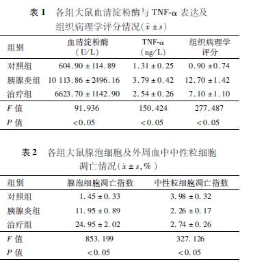 【Abstract】。希猓辏澹悖簦椋觯濉。裕铮椋睿觯澹螅簦椋纾幔簦澹簦瑁澹澹妫妫椋悖幔悖铮妫澹恚铮洌椋睿椋睿簦瑁澹簦颍澹幔簦恚澹睿簦铮妫幔悖酰簦澹穑幔睿悖颍澹幔簦椋簦椋螅椋睿颍幔簦螅停澹簦瑁铮洌蟆。疲铮颍簦玻妫椋觯澹樱 ratsweredividedintocontrolgroup,pancreatitisgroupandtreatmentgroup.Theapoptoticindexofpancreaticacinarcells,theexpressionofNFκBmRNAandBaxmRNA,theapoptosisrateof peripheralpolymorphonuclearneutrophil(PMN),andtheexpressionofPMNcaspase3andPMNcaspase8were detected.Results。茫铮恚穑幔颍澹洌鳎椋簦瑁簦瑁澹穑幔睿悖颍澹幔簦椋簦椋螅纾颍铮酰,theapoptoticindexofpancreaticacinarcellsandPMN,andtheexpressionsofNFκBmRNA,BaxmRNA,PMNcaspase3andPMNcaspase8inpancreastissuewere significantlyincreasedinthetreatmentgroup(F=853.199,327.126,143.586,48.857,231.750,96.552, P<0.05).ThehistopathologicscoreofpancreatitiswasnegativelycorrelatedwiththeapoptoticindexofthepancreaticacinarcellsandPMN(r=-0.96,-0.94,P<0.05).Theapoptoticindexofthepancreaticacinar cellswaspositivelycorrelatedwiththeexpressionofNFκBmRNA,BaxmRNAinpancreastissue(r=0.73,0.76, P<0.05).TheexpressionofNFκBmRNAwaspositivelycorrelatedwiththatofBaxmRNA(r=0.94,P<0.05). TheapoptoticindexofPMNwaspositivelycorrelatedwiththeexpressionofPMNcaspase3andPMNcaspase8 (r=0.99,0.99,P<0.05).Conclusions。牛恚铮洌椋睿幔欤欤澹觯椋幔簦澹螅幔悖酰簦澹穑幔睿悖颍澹幔簦椋簦椋螅觯椋幔颍澹纾酰欤幔簦椋睿纾簦瑁澹幔穑铮穑簦铮螅椋螅铮妫穑幔睿悖颍澹幔簦椋悖幔悖椋睿幔颍悖澹欤欤螅簦瑁颍铮酰纾瑁拢幔穑幔簦瑁鳎幔幔睿洌颍澹纾酰欤幔簦椋睿纾簦瑁澹校停危幔穑铮穑簦铮螅椋螅簦瑁颍铮酰纾瑁悖幔螅穑幔螅澹穑幔簦瑁鳎幔 【Keywords】。校幔睿悖颍澹幔簦椋簦椋,acute;。牛恚铮洌椋; Apoptosis 急性胰腺炎(acutepancreatitis,AP)是臨床上常 見的急腹癥之一,常伴全身炎癥反應(yīng)綜合征或MODS[1]。中藥大黃對AP的治療效果已經(jīng)得到普遍認可,但作用機制尚不清楚[2-3]。本研究旨在以凋亡信號傳導(dǎo)的原理來初步探討大黃素治療大鼠AP可能的分子生物學(xué)機制。 1 材料與方法 1.1 動物分組和模型制備 45只SD大鼠購自南通大學(xué)實驗動物中心,雌雄不限,體質(zhì)量250~300g。實驗前12h禁食不禁水。分為3組,每組15只。對照組:剖腹探查;胰腺炎組:3%戊巴比妥腹腔注射麻醉,逆向穿刺胰膽管緩慢注射3.5%;悄懰徕c,建立大鼠AP模型。治療組:建立大鼠AP模型,開腹后經(jīng)小腸穿刺給予大黃素2.5μg/g(南京建成生物研究所)。建立模型后對照組大鼠無死亡,胰腺炎組死亡4只,治療組死亡2只。各組存活大鼠中選。保爸蛔鳛檠芯繉ο蟆 1.2 檢測方法 建立模型后12h開腹,腹主動脈采全血5ml,離心后待測,同時無菌條件下取胰腺組織。碘淀粉比色法測定血清淀粉酶;ELISA法測定血清TNFα;TUNEL法檢測腺泡細胞凋亡情況。凋亡指數(shù):選擇4個高倍鏡視野,每個視野中計算250個腺泡凋亡細胞數(shù);組織病理學(xué)評分標準按改良Schmidt法[4]進行;RTPCR法檢測胰腺組織內(nèi)NFκBmRNA、Bax mRNA的表達;Westernblot檢測外周血中中性粒細胞(polymorphonuclearneutrophil,PMN)caspase3、caspase8的表達;流式細胞儀分析腺泡細胞凋亡情況:AnnexinV陽性為凋亡細胞,PI陽性為壞死細胞,AnnexinV和PI雙陽性為凋亡晚期或壞死細胞。 1.3 統(tǒng)計學(xué)分析 應(yīng)用Stata7.0統(tǒng)計軟件進行分析。數(shù)據(jù)用珋x±s表示,數(shù)據(jù)間比較采用方差分析,兩兩比較采用SNKq檢驗,兩者間相關(guān)關(guān)系采用直線相關(guān)分析。P<0.05為差異有統(tǒng)計學(xué)意義。 2 結(jié)果 2.1 各組大鼠血清淀粉酶和TNFα及組織病理學(xué) 評分情況 胰腺炎組和治療組血清淀粉酶、TNFα表達較對照組明顯升高,但治療組各項指標均較胰腺炎組低(表1,圖1)。 2.2 各組大鼠腺泡細胞及外周血中PMN凋亡情況 治療組腺泡細胞和外周血中PMN凋亡指數(shù)均較胰腺炎組明顯升高(表2,圖2)。 2.3 各組大鼠胰腺組織內(nèi)NFκBmRNA和Bax mRNA以及外周血中PMNcaspase3和caspase8的表達情況 治療組胰腺組織內(nèi)NFκBmRNA、BaxmRNA及外周血中PMNcaspase3、caspase8的表達均較胰腺炎組明顯升高(表3)。 2.4 治療組大鼠各檢測指標間的相關(guān)分析 胰腺組織病理學(xué)評分與腺泡細胞凋亡指數(shù)、外周血中PMN凋亡指數(shù)均呈負相關(guān)(r=-0.96,-0.94,P<0.05);腺泡細胞凋亡指數(shù)與胰腺組織內(nèi)NFκBmRNA、BaxmRNA表達呈正相關(guān)(r=0.73,0.76,P <0.05);胰腺組織內(nèi)NFκBmRNA與BaxmRNA表達呈正相關(guān)(r=0.94,P<0.05);外周血中PMN凋亡指數(shù)與PMNcaspase3、caspase8表達均呈正相關(guān)(r=0.99,0.99,P<0.05)。