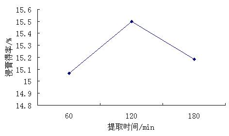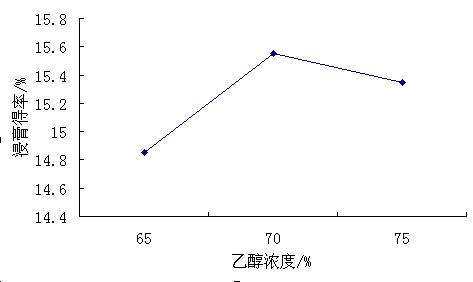 通過實驗結(jié)果可以得到,如預期分析的一樣, A2B2C1D3為最優(yōu)方案,A1B2C1D3為較優(yōu)方案。都比試驗號6的浸膏得率高,從縮短了提取時間降低了能耗角度考慮,可以采取A1B2C1D3的較優(yōu)方案,即提取時間60min,乙醇濃度70%,乙醇用量6倍,提取次數(shù)3次。 4.趨勢圖 浸膏得率對提取時間做趨勢圖,如圖2.1所示。 圖2.1 效應(yīng)曲線圖,因素為提取時間 由趨勢圖可以看出,隨提取時間水平的變動,浸膏得率在提高,120min時最高,之后得率降低。 浸膏得率對乙醇濃度做趨勢圖,如圖2.2所示。