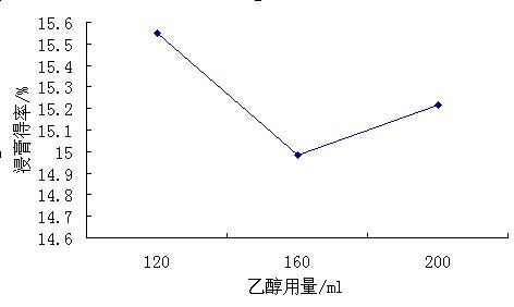 圖2.2 效應(yīng)曲線圖,因素為乙醇濃度 由趨勢圖可以看出,隨乙醇濃度水平的變動,浸膏得率在提高,70%時最高,之后得率降低。 浸膏得率對乙醇用量做趨勢圖,如圖2.3所示。
