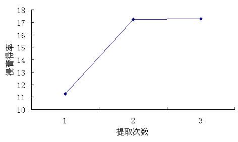 圖2.4 效應(yīng)曲線圖,因素為提取次數(shù) 由趨勢圖可以看出,隨提取次數(shù)水平的變動,浸膏得率在提高,2次時最高,之后緩慢提升。 2.4.3 討論 1.原料的目數(shù)的篩選 在提取過程中發(fā)現(xiàn),用80目篩篩過的厚樸,由于顆粒較細,在回流提取過程中藥材很粘稠,容易產(chǎn)生暴沸現(xiàn)象,尤其是在2次以上回流次數(shù)時尤其明顯,即使加入沸石也不容易解決。抽濾時,過濾的溶液不是很澄清,懷疑是由于顆粒細,而濾紙孔徑有限,但這種輕盈也可能與厚樸酚的水溶性有關(guān),厚樸酚在沸騰的乙醇中溶解度大,隨著抽濾的進行,溫度降低,在抽濾瓶中可能出現(xiàn)重結(jié)晶的想象?紤]降低過篩目數(shù)是否可以解決這一問題,于是設(shè)計實驗,用同一厚樸原料分別過20目、40目、80目的篩,選正交設(shè)計表中1號試驗的實驗方案進行對比試驗,如表2.6所示。 表2.6原料的目數(shù)的篩選對比試驗