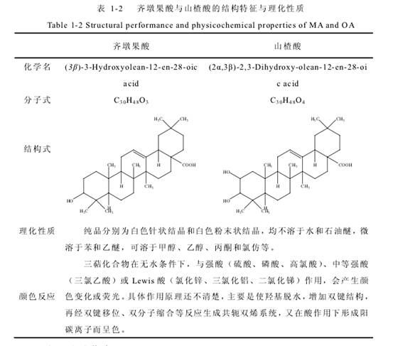 2.2 三萜類 三萜類化合物主要是由 6 個異戊二烯結(jié)構(gòu)單元構(gòu)成,大部分為含 30 個碳原子的萜類化合物。油橄欖果三萜類成分主要為五環(huán)三萜類化合物,Guinda A 等從油橄欖果和葉中分離出 7 種三萜類化合物,分別對其進(jìn)行了結(jié)構(gòu)鑒定為高根二醇,熊果醇、齊墩果酸、熊果酸、山楂酸、甘草次酸。而即使是同一品種,油橄欖果的采摘時間不同,其中的三萜成分及含量也有所差異。,油橄欖果渣中主要有效成分以兩種五環(huán)三萜類化合物—齊敦果酸和山楂酸含量最高,其結(jié)構(gòu)及理化性質(zhì)如表 1-2 所示。