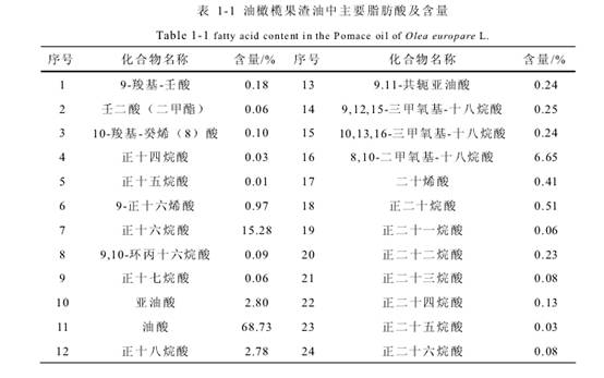 油橄欖又稱齊墩果,目前,我國共發(fā)展油橄欖六十余萬畝,主要分布于甘肅隴南、云南西北部金沙江流域、四川廣元、達(dá)州地區(qū),并已初具規(guī)模。甘肅隴南市是我國油橄欖最大的種植基地之一。油橄欖果實為核果。果實由果皮、果肉、果核組成。果實的形狀有卵圓形、橢圓形、長橢圓形、圓形等。果實成熟時,一般呈紫黑色。果實和果核的特點,是鑒定品種的重要依據(jù)之一。果實的形狀和大小品種不同而有明顯差異,不同品種的油橄欖的含油率及其有效成分的含量也均有一定的差異。油橄欖中含有三萜類、裂環(huán)烯醚萜類、黃酮類、有機(jī)酸等多種有效成分。 1 油橄欖的實用價值 由于油橄欖果中富含優(yōu)質(zhì)油脂,一般含油率在 11%~27.6%,所以栽培油橄欖最主要的用途就是利用果實中油脂加工橄欖油!伴蠙煊汀笔遣捎矛F(xiàn)代工藝?yán)湔ヌ崛〉闹参镉停且环N非干性食用油,被人體消化吸收率高達(dá) 94.5 %以上,是世界上唯一在天然狀態(tài)下直接被食用的油。它之所以被看做有較高營養(yǎng)價值的植物油,是由于其富含可以降低膽固醇和血脂的油酸以及人體所必須的維生素和微量元素。同時,橄欖油也是食品、乳品、保健、醫(yī)藥、化妝、化工的重要原料,國際橄欖油理事會(International Olive Oil Council,IOOC)及歐盟的資料表明,橄欖油對健康的益處主要有:促進(jìn)血液循環(huán)、改善消化系統(tǒng)功能、保護(hù)皮膚、提高內(nèi)分泌系統(tǒng)功能、防癌、防輻射、抗衰老、預(yù)防心腦血管疾病等。但是,僅靠鮮果榨油獲取經(jīng)濟(jì)收入,效益是不高的。長期以來,油橄欖產(chǎn)業(yè)在栽培、種植,尤其是橄欖油深加工方面的研究與開發(fā),已取得重大的進(jìn)展。橄欖鮮果還可用于制作罐頭、蜜餞、果醬,橄欖枝枝梢和葉可加工橄欖茶,油橄欖樹屬于常青樹,還可作為優(yōu)質(zhì)木材以及重要的山地和城區(qū)綠化樹種。但是,對于油橄欖產(chǎn)業(yè)產(chǎn)生的廢棄物—油橄欖經(jīng)壓榨后的廢棄殘渣,除了部分被用作飼料、肥料之外,絕大部分被直接廢棄,不但污染了環(huán)境,而且在一定程度上造成了資源的浪費。不僅導(dǎo)致大量的天然植物資源的浪費,而且引發(fā)環(huán)境污染、生態(tài)惡化等一系列問題。因此,對油橄欖果渣進(jìn)行綜合開發(fā)利用,使其變廢為寶,充分利用資源,對于提高油橄欖加工綜合經(jīng)濟(jì)效益和社會效益,具有重大的意義。 2 油橄欖果及果渣的化學(xué)成分 2.1 脂肪酸類 油橄欖果及果渣中均含有游離的脂肪酸類化合物,分為飽和脂肪酸和不飽和脂肪酸,其中不飽和脂肪酸含量達(dá) 75 %-88 % ,對人體具有多種保健功效?拙S寶等利用氣相色譜-質(zhì)譜(GC-MS)分析了油橄欖果渣油中的脂肪酸成分及其含量,結(jié)果如表 1-1 所示,結(jié)果表明,正己烷萃取的果渣油主要脂肪酸為油酸(68.73 %)、棕櫚酸(15.28 %) 、8,10-二甲氧基-十八烷酸(6.65 %)、亞油酸(2.80 %)、硬脂酸(2.78 %) 和棕櫚油酸(0.97 %),其主要脂肪酸組成與橄欖油類似。