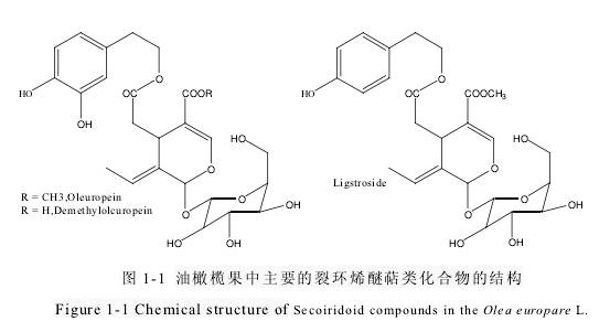裂環(huán)烯醚萜是環(huán)戊烷單萜衍生物中的一類化合物,是由環(huán)烯醚萜類化合物在C7、C8 處裂環(huán)而成,是木樨欖屬植物標(biāo)記性化合物,目前,從油橄欖中分離得到的裂環(huán)烯醚萜類化合物共 25 種。圖 1-1 列出了油橄欖果中主要的裂環(huán)烯醚萜類化合物的結(jié)構(gòu),其中尤其以橄欖苦苷具有重要的藥理活性。