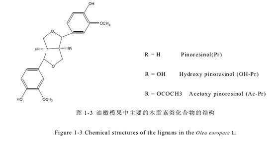 2.4 黃酮類 黃酮類化合物(flavonoids) 是植物代謝過程中產(chǎn)生的一類重要天然有機(jī)化合物,近 30 年來一直是國內(nèi)外研究開發(fā)的熱點。Giovanna Vlahov 等對三個不同采摘階段的油橄欖果中的主要黃酮苷類成分木犀草苷、蘆丁、矢車-3-葡萄糖苷、花青素-3-蕓香糖甙進(jìn)行了分析。 2.5 木脂素類 目前,從油橄欖中分離得到的木脂素類化合物已有 21 種,圖 1-3 所示為油橄欖果中木脂素類成分的主要結(jié)構(gòu),Maria Lopez 等利用 HPLC/DAD/ESI/MS 技術(shù),對油橄欖果中的木脂素類成分 pinoresinol(Pr)、Hydroxy pinoresinol(OH-Pr)、Acetoxy pinoresinol(Ac-Pr)進(jìn)行了分析鑒定,結(jié)果表明油橄欖果中總木脂素類含量在 0.1-0.29mg·g-1。