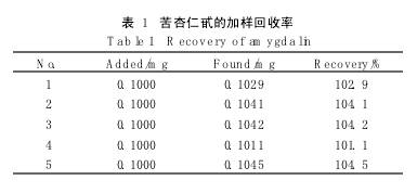 精密度實(shí)驗(yàn):取質(zhì)量濃度分別為5,10,15mg/L的苦杏仁甙標(biāo)準(zhǔn)液,分別重復(fù)進(jìn)樣5次,測(cè)得峰面積,計(jì)算其峰面積的相對(duì)標(biāo)準(zhǔn)偏差(RSD)分別為0·71%,0·49%和0·88%,說(shuō)明色譜分析方法具有良好的精密度。 穩(wěn)定性實(shí)驗(yàn):取同一份樣品溶液,于室溫下放置,分別在0,2,4,6,8h取樣,在相同色譜條件下測(cè) 定峰面積。苦杏仁甙的峰面積基本保持不變,相對(duì)標(biāo)準(zhǔn)偏差為0·40%。說(shuō)明被測(cè)組分在本實(shí)驗(yàn)條件下穩(wěn)定。 加樣回收率:取已知含量的純山楂粉末樣品5份,分別加入0·100 0mg的苦杏仁甙標(biāo)準(zhǔn)品,按樣品測(cè)定方法處理和測(cè)定。計(jì)算加樣回收率,結(jié)果見(jiàn)表1。由表1數(shù)據(jù)計(jì)算得苦杏仁甙的平均回收率為103·4%,RSD為1·05%。說(shuō)明本方法可靠。