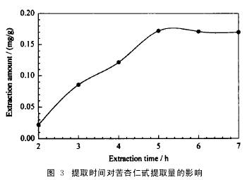 2.2 山楂中苦杏仁甙提取方法的優(yōu)化 苦杏仁甙易溶于甲醇,所以選用甲醇作為提取劑。甄攀等[8]用甲醇從郁李中提取苦杏仁甙并測(cè)定了含量,馬辰等[9]也用甲醇從苦杏仁中提取苦杏仁甙并進(jìn)行了含量測(cè)定。但甲醇能將一些色素和酯類(lèi)大分子同時(shí)提取出來(lái),在分析過(guò)程中污染色譜柱,從而降低柱效,使苦杏仁甙難以和其他物質(zhì)分離。石油醚是一種非極性溶劑,包括色素和酯類(lèi)在內(nèi)的親脂性物質(zhì)易溶于其中,而苦杏仁甙難溶于石油醚。所以首先用石油醚除去這些干擾成分。實(shí)驗(yàn)表明在 石油醚相中檢測(cè)不到苦杏仁甙,說(shuō)明苦杏仁甙幾乎未被石油醚萃取出來(lái)。 索氏提取是中藥有效成分提取的最常用方法,由于它的溶劑是循環(huán)使用的,所以可以更有效地提取中藥的有效成分。選擇70℃的水浴條件是因?yàn)闇囟忍蜁?huì)使溶劑的循環(huán)減慢,而溫度太高則導(dǎo)致苦杏仁甙的分解。圖3是不同提取時(shí)間(2,3,4,5,6和7h)和對(duì)應(yīng)的苦杏仁甙提取量(提取的苦杏仁甙質(zhì)量與原藥材粉末質(zhì)量之比,下文的“苦杏仁甙的含量”也用此表示)的曲線(xiàn),從圖3可以看出5h可以達(dá)到提取平衡。