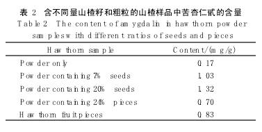 2.3 不同樣品形態(tài)的山楂中苦杏仁甙的含量 表2列出了含不同量山楂籽的山楂粉末和不同形態(tài)的山楂中苦杏仁甙的含量?梢钥闯,隨著山楂籽含量的增加苦杏仁甙的含量也在增加。由此可以推斷出苦杏仁甙在山楂籽中的含量較高。車(chē)?guó)P斌也曾報(bào)道過(guò)苦杏仁甙廣泛存在于杏、桃、李子、蘋(píng)果、山楂等多種薔薇科植物籽和苦扁桃種子中,而且隨著粗粒含量的增加測(cè)得的苦杏仁甙的含量也在增加。由此可以推斷出用山楂粗粒提取苦杏仁甙比用山楂粉提取的量要大。Hwang等曾比較了不同形態(tài)杏仁中提取出的苦杏仁甙的量,也發(fā)現(xiàn)了用粗粒提取時(shí)苦杏仁甙的量比用粉末提取的量要高原因是苦杏仁甙在與之共存的苦杏仁甙酶(emulsin)的作用下水解,山楂粉末的比表面積大,與苦杏仁甙酶接觸充分,促進(jìn)了苦杏仁甙的水解,造成測(cè)得的苦杏仁甙的含量比粗粒山楂低。
