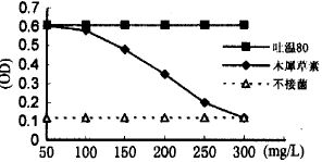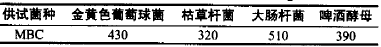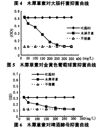 不同濃度木犀草素對(duì)枯草桿菌等菌抑制結(jié)果見 圖3~ 圖6。從圖中可看出:當(dāng)木犀草素濃度增大到 50 mg/L時(shí),吸光度開始降低,說明隨濃度增加,菌的 生長(zhǎng)受到抑制數(shù)量在減少,此濃度為起始抑菌濃度: 當(dāng)濃度高到200 mg/L,吸光度值降到與藥物不接菌線 重合,說明此時(shí)菌生長(zhǎng)受到完全抑制,此濃度為完全 抑菌濃度。從圖3~ 圖6可看出,對(duì)枯草桿菌起始抑制 濃度為50 mg/L,完全抑制濃度為200 mg/L;對(duì)金黃 色葡萄球菌起始抑制濃度為25 mg/L,完全抑制濃度 為300 mg/L;對(duì)大腸桿菌起始抑制濃度為50 mg/L, 完全抑制濃度為300 mg/L;對(duì)啤酒酵母起始抑制濃度 為25 mg/L,完全抑制濃度為250 mg/L。實(shí)驗(yàn)測(cè)得供 試驗(yàn)菌種MBC見表2。 表2 木犀草素殺菌MBC值(m#L)