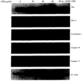 圖4 芹菜素(API)對(duì)BGC823細(xì)胞線粒體信號(hào)途徑相關(guān)蛋白的影響。不同濃度的API(20,40,80 g/mL)處理BGC823細(xì)胞 48 h,Western印跡分別檢測(cè)bax,bcl一2,細(xì)胞色素C,caspase一3和‘’aspase-9的表達(dá) Fig.4 Effect of API on the expression of mitochondrial signal pathway related proteins in apoptosis in BGC823.BGC823 cells were treated with diferent concentrations(20,40,80 p~g,/mL)of API for 48 h,and then protein expressions of bax,bcl-2,cyto· chrome c。caspase一3 and caspase-9 were determined by Western blot 3 討 論 API可以使人前列腺癌細(xì)胞及人白血病細(xì) 胞HL一60發(fā)生選擇性周期阻滯,并誘導(dǎo)細(xì)胞凋 亡。其誘導(dǎo)凋亡的機(jī)制可能是通過細(xì)胞色素C 的釋放及半胱氨酸酶(casepase一9,casepase一3)的 激活而實(shí)現(xiàn) 。此外,API也可以通過激活 P53/wafl途徑發(fā)揮抗腫瘤作用。API能使腫瘤 細(xì)胞內(nèi)P53蛋白、P2 1/WAF1蛋白水平升高, 二者可以使細(xì)胞周期發(fā)生阻滯,并通過P53途 徑誘導(dǎo)腫瘤細(xì)胞凋亡 。核因子一KB(NF—KB)、 B細(xì)胞淋巴瘤/ 白血病2(bcl一2),bax(bcl一2的 家族成員)也參與了API的誘導(dǎo)腫瘤細(xì)胞凋亡 作用 。NF—KB的活化能阻止處于半胱氨酸 酶聯(lián)反應(yīng)上游的casepase一8活化,并引起凋亡抑 制劑蛋白的表達(dá)。API能夠抑制NF—KB蛋白的 表達(dá),使bax,bcl一2的比值發(fā)生轉(zhuǎn)變,最終誘導(dǎo)細(xì)胞凋亡的發(fā)生。本文采用PI染色FCM分析 發(fā)現(xiàn):隨著API濃度升高,BGC823細(xì)胞凋亡率 增加。說明API具有促進(jìn)BGC823細(xì)胞凋亡 作用。 線粒體跨膜電位在維持線粒體膜的完整性 和功能方面起著重要作用 J。本研究用一種能 被線粒體選擇性吸收的熒光染料羅丹明123作 為指示劑,它的吸收率與△ll,m 成正比,F(xiàn)CM分 析測(cè)定結(jié)果顯示,API能降低BGC823細(xì)胞中羅 丹明l23的熒光強(qiáng)度,呈劑量依賴性。表明API 能以劑量依賴方式降低BGC823細(xì)胞中zX,m。 線粒體依賴性細(xì)胞凋亡通路中,線粒體跨膜電 位降低導(dǎo)致Cyt c釋放增加。本研究用Western 印跡檢測(cè)BGC823細(xì)胞胞漿中細(xì)胞色素c蛋白 的表達(dá),結(jié)果證實(shí)隨著API濃度增大,細(xì)胞色素 c表達(dá)增加。以上結(jié)果表明,API能降低 BGC823細(xì)胞線粒體跨膜電位,促進(jìn)細(xì)胞色素c釋放。 細(xì)胞色素c從線粒體釋放后與ATP、凋亡蛋 白酶激活因子(apoptotic protease activating factor· 1,Apaf.1)聯(lián)合作用,依次激活caspase·9, caspase.3和PARP等,導(dǎo)致細(xì)胞凋亡。本實(shí)驗(yàn)用 caspase.9分光光度法檢測(cè)試劑盒檢測(cè)caspase·9 的活性,發(fā)現(xiàn)API能增加BGC823細(xì)胞中 caspase.9的活性。用Western印跡檢測(cè)發(fā)現(xiàn)API 能上調(diào)caspase.9和caspase.3蛋白的表達(dá)。Bcl· 2家族成員在細(xì)胞凋亡的線粒體途徑中起重要 調(diào)控作用 。在細(xì)胞凋亡過程中,bc1.2家族 促凋亡成員如bax過表達(dá),形成同源二聚體后被 激活,發(fā)生構(gòu)象改變,可引起線粒體大量釋放 Cyt c;而抗凋亡成員如bc1.2和bc1.XL過表達(dá), 與bax形成異源二聚體,可對(duì)Apaf.1結(jié)構(gòu)進(jìn)行 調(diào)控,抑制Cyt c釋放,最終發(fā)揮抑制細(xì)胞凋亡 作用¨ “』。本文用Western印跡檢測(cè)BGC823細(xì) 胞中bax和bc1.2蛋白的表達(dá)情況,發(fā)現(xiàn)API以 劑量依賴方式上調(diào)bax的表達(dá),下調(diào)bc1.2的表 達(dá),使bax/bc1.2的比值增大。而caspase.9抑制 劑Ac.LEHD.CHO能阻斷API的上述作用。說 明API通過調(diào)節(jié)bax/bc1.2比值激活BGC823細(xì) 胞中caspase.9,caspase.3級(jí)聯(lián)反應(yīng)。 綜上所述,API能上調(diào)bc1.2家族促凋亡成 員bax蛋白表達(dá),下調(diào)bc1.2蛋白表達(dá),使bax/ bc1.2比值升高,降低線粒體跨膜電位,促進(jìn)Cyt c釋放,從而激活caspase.9,caspase.3級(jí)聯(lián)反應(yīng), 通過調(diào)控線粒體凋亡誘導(dǎo)途徑誘導(dǎo)人胃癌 BGC823細(xì)胞凋亡。 |