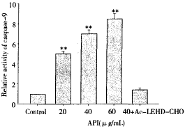 圖3 芹菜素(API)對(duì)BGC823細(xì)胞caspase-9活性的影響。 不同濃度的API(20,40,80 g/mL)處理BGC823細(xì)胞 48 h后檢測(cè)caspase-9活性(x±s,,z=3) 與對(duì)照組比 較,}}P<0.01 Fig.3 Effect of API on activity of caspase-9 in BGC823 cells. BGC823 cells were treated with diferent concentrations (20,40,80 g/mL)of API for 48 h,and then activity of caspase一9 was determined(x±5,,z=3) Compared with contro1. } } P <0.01