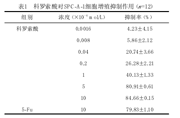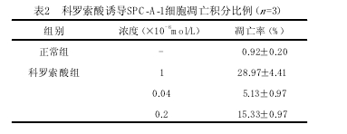 2. 科羅索酸對SPC-A-1細胞凋亡的影響 取對數(shù)生長期SPC-A-1細胞接種于包被多聚賴氨酸的玻片上,于24孔板中孵育。待細胞長至80%融合度時,細胞給予1×10-6、0.2×10-6、0.04×10-6mol/L的科羅索酸,按“1.”項條件孵育48h。取出玻片,PBS溶液潤洗,然后用AO/EB溶液細胞染色,并于熒光顯微鏡(Olympus IX71倒置熒光顯微鏡奧林巴斯BX51,日本)觀察拍照。細胞凋亡率評價根據綠色(正常)或瑪瑙色(凋亡)彩色面積,應用Image-Pro Plus picture分析軟件計算凋亡率。 表2結果顯示1×10-6、0.2×10-6、0.04×10-6mol/L科羅索酸組細胞的凋亡率分別為28.97%±4.41%、15.33%±0.97%、5.13%±0.97%。研究結果表明科羅索酸具有誘導SPC-A-1細胞凋亡活性。