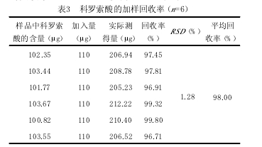 3.2 供試品溶液的制備取夏枯草藥材,100℃烘干,粉碎機粉碎,粉末過40目篩。精密稱取1.0g樣品粉末,置100mL具塞圓底燒瓶中,加入無水甲醇,回流提取2次(2h/次,每次20mL),合并濾液,60℃條件下于旋轉蒸發(fā)儀中回收甲醇,殘渣用無水甲醇定容至10mL瓶中,過0.45μm 濾膜,即得樣品溶液。 3.3 標準曲線的制備精密稱取科羅索酸對照品適量,加無水甲醇溶解,配制成0.550mg/mL 的對照品溶液10mL,備用。取對照品溶液,依次稀釋成68.8、34.4、17.2、8.6、4.3μg/mL濃度,分別進樣分析,測定其峰面積。以峰面積為縱坐標進行線性回歸,得科羅索酸的回歸方程、相關系數(shù)、線性范圍分別為Y=36.334X+18.819(R2=0.9998),在4.29-68.75μg/mL的進樣量范圍內,與峰面積具有良好的線性關系。 3.4 精密度實驗取同一夏枯草樣品溶液,連續(xù)進樣6次,記錄保留時間及峰面積,計算科羅索酸保留時間和峰面積的RSD值分別為0.46%和2.07%。結果表明,儀器精密度良好。 3.5 重復性實驗取同一樣品粉末,按供試品溶液制備方法分別制備6份供試品溶液,按上述色譜條件測定,計算科羅索酸保留時間和峰面積的RSD值分別為0.13%和2.54%。結果表明,方法重復性良好。 3.6 穩(wěn)定性實驗取同一樣品溶液,分別于0、2、4、8、12、24h進樣測定?屏_索酸保留時間和峰面積的RSD值分別為0.39%和1.54%。結果表明,品在24h內穩(wěn)定。 3.7 加樣回收率精密稱取已知含量的夏枯草提取物粉末6份,分別置100mL具塞圓底燒瓶中,各精密加入137.5μg/mL科羅索酸0.8mL。結果科羅索酸平均回收率98.00%,RSD值為1.28%(見表3)。