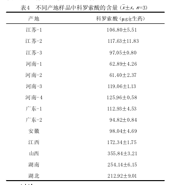 4. 不同產地夏枯草中科羅索酸含量比較取不同產地夏枯草屬藥材粉末1.0g,精密稱取,按“3.2”項下方法制備供試品溶液,測定不同產地夏枯草中科羅索酸的含量。從表4中可以看出,不同產地的夏枯草中科羅索酸含量存在著較大差異。山西產地藥材中科羅索酸含量最高,為(355.84±3.21)μg/g生藥;河南-2批次藥材科羅索酸含量最低,為(61.40±2.37)μg/g生藥。對于不同河南產地的藥材,不同批次之間也存在這接近1倍的含量差異。