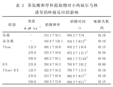 結(jié)果表明,在實(shí)驗(yàn)劑量下,Thea對(duì)自主活動(dòng)沒有影響,HE對(duì)小雞自主活動(dòng)雖有輕度抑制,但無顯著性差異。分離發(fā)聲的檢測(cè)表明,分離組小雞與未分離組小雞相比,頻率改變不明顯,但叫聲明顯增強(qiáng)(dB負(fù)值減小,P<0·01),說明分離應(yīng)激可以使叫聲增強(qiáng)。給藥后鳴叫強(qiáng)度減小(P<0·05,P<0·01)。而與分離對(duì)照組相比,二藥合用以后dB不變而隨著Thea濃度增加PF有減小趨勢(shì),需要進(jìn)一步試驗(yàn)證實(shí)。由于藥物對(duì)自主活動(dòng)均無明顯影響,在此劑量下不具有鎮(zhèn)靜作用,說明小雞發(fā)聲強(qiáng)度減少與鎮(zhèn)靜作用無關(guān)。 2.2 Thea對(duì)福爾馬林誘導(dǎo)的足跖疼痛的影響 分組同前。觀察福爾馬林致痛后3 min小雞的行為表現(xiàn)。注射福爾馬林引起小雞炎性疼痛。分離組小雞疼痛鈍抑(stressinduced analgesia),疼痛持續(xù)時(shí)間明顯減少(P<0·01),說明分離應(yīng)激使疼痛感覺減弱。Thea于25 mg·kg-1和50 mg·kg-1單獨(dú)應(yīng)用,可以增加抬腳持續(xù)時(shí)間,提高疼痛感覺(P<0·05),說明其有對(duì)抗分離應(yīng)激導(dǎo)致疼痛減弱的作用。HE(25 mg·kg-1)單獨(dú)應(yīng)用對(duì)疼痛減弱反應(yīng)沒有影響[9]。從本實(shí)驗(yàn)檢測(cè)來看,不同劑量的Thea合用HE(25 mg·kg-1)對(duì)此模型協(xié)同作用不明顯(表2)。 3 討論 本實(shí)驗(yàn)的目的是觀察藥物對(duì)小雞分離應(yīng)激行為的影響。離開群體可以使小雞分離發(fā)聲增加而對(duì)福爾馬林引起的疼痛感覺減弱。分離模型(separationmodels)包括靈長類動(dòng)物的母子分離、群居動(dòng)物的孤養(yǎng)等。研究表明,動(dòng)物母子分離后出現(xiàn)激越、哀鳴等特征性表現(xiàn)。最有價(jià)值的分離動(dòng)物模型是除人類之外的靈長類。然而由于稀少和昂貴,很少有人用其進(jìn)行藥物篩選或作用機(jī)制的研究。事實(shí)上,許多動(dòng)物如貓、狗、鼠和雞等都會(huì)因?yàn)榕c群體隔離出現(xiàn)絕望現(xiàn)象。其中,小雞分離模型(separation model inchicken)是最典型的抗議絕望(protestdespair)模型。孵出1周的小雞,單獨(dú)隔離,開始是困苦鳴叫(shrill calls termed distress vocalization test 1985,Gardner),頻度很高,典型者1 h后減低?菇箲]藥、抗抑郁藥等均能明顯影響困苦鳴叫的時(shí)間;而抗膽堿藥和中樞興奮藥則無效。