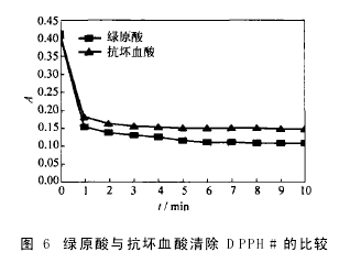 結(jié)果表明, 1. 0 g/L的金銀花中綠原酸的抑菌效果明顯,尤其是大腸桿菌和藤黃八疊球菌,它們的抑菌圈直徑分別是25. 95 mm和23. 55 mm即為極敏,金黃色葡萄球菌的抑菌圈直徑是19. 72 mm為高敏,枯草芽胞桿菌抑菌圈直徑是13. 65 mm為中敏。慶大霉素雖對一些致病菌等具有強(qiáng)抑菌作用,但它對人體有腎 毒性、耳毒性、過敏反應(yīng)等,而在金銀花中提取的綠原酸的毒副作用還未見文獻(xiàn)報(bào)道,又因?yàn)榻疸y花來源豐富、價(jià)格低廉,所以金銀花與慶大霉素等比較,在臨床應(yīng)用上更為安全、方便,可供臨床選用防治致病菌等感染的參考。 2.4 綠原酸抗氧化性 2. 4. 1 綠原酸清除DPPH·測定 20世紀(jì)80年代,自由基對健康的影響日益為人們所認(rèn)識,現(xiàn)代醫(yī)學(xué)和營養(yǎng)保健學(xué)認(rèn)為,自由基在人體內(nèi)可直接引起許多疾病,而且與其他一些疾病的發(fā) 生也有關(guān)。 綠原酸是具有酚羥基的一類還原性化合物,在復(fù)雜反應(yīng)體系中,由于其自身被氧化而具有抗氧化作用。其途徑就是綠原酸分子的酚羥基與有害自由基反應(yīng)變成較穩(wěn)定的半醌式自由基,從而終止有害自由基的鏈?zhǔn)椒磻?yīng);其次是綠原酸通過自身的還原性質(zhì)直接給出電子消耗掉有害自由基。深入研究綠原酸的抗氧化機(jī)理,對天然抗氧化劑的篩選,改進(jìn)抗氧化劑的結(jié)構(gòu),獲取性能更加優(yōu)良的抗氧化劑具有重要意義。 2, 2-二苯基-α-苦基肼自由基(DPPH·)是一種很穩(wěn)定的以氮為中心的自由基,若受試物能將其清除,則表示受試物具有降低羥自由基、烷自由基或過氧化自由基的有效濃度和打斷脂質(zhì)過氧化鏈反應(yīng)的作用。DPPH·有個(gè)單電子,在517 nm有強(qiáng)吸收,其乙醇溶液呈深紫色,加入受試物后,在517 nm處可以動態(tài)監(jiān)測其對DPPH·的清除效果。綠原酸和抗壞血酸的清除DPPH·能力如圖6所示。