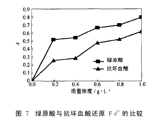 綠原酸與抗壞血酸清除DPPH·能力隨時(shí)間的延長而增強(qiáng),在反應(yīng)到5min以后,綠原酸與抗壞血酸基本將DPPH·清除完全,而且綠原酸清除DPPH·能力比抗壞血酸要強(qiáng)。由此可以看出,綠原酸與自由基反應(yīng),能使自由基成為更為穩(wěn)定的物質(zhì);綠原酸屬于能與自由基快速反應(yīng)的小分子化合物,因此它是潛在重要的生物抗氧化劑。 2. 4. 2 綠原酸和抗壞血酸還原力的比較 還原能力的測定,可檢驗(yàn)化合物是否為良好的電子供應(yīng)者。它所供應(yīng)的電子可以使Fe3+還原為Fe2+,使體系溶液顏色改變,即可反映出體系中氧化還原狀態(tài)的改變。加入化合物后,在700 nm處可以推知體系中Fe3+的變化。 綠原酸和抗壞血酸還原Fe3+的能力如圖7所示。由圖7可以看出,體系溶液在較低的濃度時(shí),綠原酸與抗壞血酸還原能力隨濃度的增加而增強(qiáng),而綠原酸的還原能力強(qiáng)于抗壞血酸。