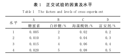 摘 要:采用特殊的脫苦方法,既使苦杏仁脫苦,又可得到具有藥用價值的苦杏仁甙。以苦杏 仁為原料,通過對杏仁漿的不同配比、不同穩(wěn)定劑、殺菌條件的研究,確定了較經(jīng)濟簡便的杏仁乳生產(chǎn)工藝、工藝參數(shù),杏仁乳的最佳配方,并得到了具有良好香味、口感和穩(wěn)定性的產(chǎn)品。 關(guān)鍵詞:苦杏仁甙;杏仁乳;穩(wěn)定劑;正交試驗 苦杏仁富含多種營養(yǎng)成分,其脂肪含量達35 %~50 %,95 %以上為亞油酸、亞麻酸等不飽和脂肪酸;蛋白質(zhì)含量約27 %,杏仁蛋白中所含的關(guān)鍵性氨基酸搭配平衡合理;總糖4.1 %,苦杏仁甙3%;富含多種礦質(zhì)元素和維生素,其中鈣、鐵、鉀、鎂的含量分別為牛奶的3、7、4、6倍;苦杏仁有止咳、化痰、潤肺、養(yǎng)顏、清熱、通便的功效,F(xiàn)代醫(yī)學臨床調(diào)查揭示,杏仁有降血脂、預防心臟病和動脈粥樣硬化的作用。在苦杏仁的加工過程中,首先必須將有毒物質(zhì)苦杏仁甙脫去,浸泡法脫苦除去HCN是常用的方法,不論是用清水浸泡還是用酸、堿浸泡,其實質(zhì)都是水解過程,這種方法不僅得不到苦杏仁甙,還會造成環(huán)境污染。針對上述情況,我們經(jīng)過反復探索,找到了一種既能使苦杏仁脫苦,又能得到具有藥用作用苦杏仁甙的脫毒方法,同時不需要高壓均質(zhì)也能生產(chǎn)出優(yōu)質(zhì)杏仁乳的苦杏仁,為苦杏仁的綜合開發(fā)利用開辟了新的途徑。 1 材料與方法 1.1 材料 1.1.1 原料 苦杏仁(購于陜西麟游縣罐頭廠);白砂糖(市售)。 1.1.2 輔料 分子蒸餾單甘酯百合牌(HLB=8)(廣州食品添加劑技術(shù)開發(fā)公司生產(chǎn));銀谷牌BE-2(廣州市輕工業(yè)研究所生產(chǎn));新科牌XL-200(HLB≥10)(浙江省金華市多湖催化劑廠生產(chǎn));富安牌穩(wěn)定劑(河南省博愛縣飲品工業(yè)研究所生產(chǎn));SE系列蔗糖酯(HLB=13,HLB=15)(煙臺市食品添加劑有限公司生產(chǎn));海藻酸鈉,糖蜜素(市售)。所有實驗材料均符合有關(guān)規(guī)定。 1.1.3 主要設備 磨漿機,膠體磨,電熱恒溫水浴鍋,全自動定氮儀(瑞典TECATOR公司)。 1.2 方法 1.2.1 工藝流程 苦杏仁→清理去雜→脫衣→脫苦→磨漿→調(diào)配→均勻→裝瓶→殺菌→冷卻→成品 穩(wěn)定劑、白砂消毒清洗←玻璃瓶糖海藻酸鈉等。 1.2.2 操作要點 選料:去除杏仁中的雜質(zhì)、異物,挑選無蟲蛀、無霉爛、氧化哈敗的杏仁。 漂燙:將漂洗干凈的苦杏仁用3~4倍的沸水燙煮2~3 min,并不斷攪拌,使之漂燙均勻,迅速冷卻。漂燙時間以冷卻后容易脫皮為宜。去皮:采用人工剝皮或機械脫皮法進行去皮,去皮后的杏仁用3~4倍的水漂洗。杏仁皮可用來提取色素。脫苦去毒:依據(jù)苦杏仁甙易溶于極性溶劑的性質(zhì),將去皮的苦杏仁溶于適當?shù)娜軇┙。磨漿:按杏仁∶水=1∶20磨漿,先用磨漿機粗磨1遍后,浸提3~5 h,再用膠體磨(2 nm左右)細磨2~3遍,分別以80目、200目篩孔過濾,即可得到杏仁漿。 調(diào)配:將穩(wěn)定劑、白砂糖、海藻酸鈉、糖蜜素按配比稱量,分別溶解,按要求投入漿料中,充分攪拌混勻。 裝瓶:把漿料分裝于250 mL已消毒過的玻璃瓶中,用封蓋機壓緊瓶蓋。瓶蓋也要預先清洗消毒、烘干后使用。殺菌:殺菌規(guī)程15′—20′—15′/100℃。 1.2.3 杏仁乳稀釋倍數(shù)的確定 苦杏仁經(jīng)去皮、脫苦、磨漿、去渣后分別稀釋12、14、16、18、20、22、24、26倍,然后用自動定氮儀測定各蛋白質(zhì)含量。 1.2.4 杏仁乳穩(wěn)定劑的篩選 乳液是極為復雜的體系。其穩(wěn)定體系的獲得常需要通過試驗來確定。杏仁脂肪含量高達30 %~50 %,采用脫脂分離油脂,將使營養(yǎng)價值降低,風味和口感差,且工序繁雜,成本高。全脂型杏仁乳,必須通過添加適量的乳化劑才能保持產(chǎn)品具有良好的穩(wěn)定性。為此在稀釋倍數(shù)為20倍的杏仁乳中分別選用分子蒸餾單甘酯(HLB=8),XK-200,BE-2,蔗糖脂肪酸酯(HLB=13,15),富安穩(wěn)定劑,以0.15 %、0.20 %、0.25 %、0.30 %、0.35 %、0.40 %不同濃度進行單因素試驗,裝瓶殺菌,在37℃條件下保溫觀察7 d。 1.2.5 杏仁乳最佳配方的篩選 在稀釋倍數(shù)為20倍的杏仁乳中,采用(表1) L16(45)正交表進行白砂糖、富安穩(wěn)定劑,海藻酸鈉,糖蜜素4因素4水平試驗,裝瓶殺菌靜置30 d后進行品評,結(jié)果作統(tǒng)計分析和檢驗。品評標準(表2)參照國家含乳汁飲料衛(wèi)生標準GB11673—89自己制定。