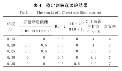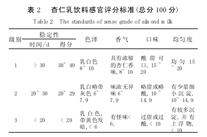 1.2.6 殺菌工藝參數(shù)的選擇 將杏仁乳裝瓶壓蓋后,放入60~70℃熱水中,在8 min內(nèi)加熱至沸,開始計時,分別在沸水中保持10、15、20、25、30 min,然后5 min內(nèi)冷卻至40℃,在37℃下保溫10 d,觀察其情況和穩(wěn)定性。 2 結(jié)果與分析 2.1 脫毒去苦 本實驗所采用的方法,不破壞杏仁的外觀形狀和風味,可使苦杏仁甙的提取率達到65 %~70 %,得到的苦杏仁甙顏色潔白、純度高,克服了傳統(tǒng)方法和生產(chǎn)中苦杏仁脫苦對環(huán)境造成的污染問題。既能使苦杏仁脫苦,同時又能得到具有重要藥理作用的苦杏仁甙。 苦杏仁中豐富的苦杏仁甙,能在體內(nèi)生成苯甲醛進而轉(zhuǎn)化為安息香酸和氰化物,抑制和殺死癌細胞,緩解疼痛,有明顯的防癌治癌作用,同時苦杏仁甙也是苦杏仁中止咳、平喘、鎮(zhèn)痛的有效成分。 2.2 乳稀釋倍數(shù)的確定 作為植物蛋白飲料,一般要求蛋白質(zhì)含量≥1%,因此杏仁乳的稀釋倍數(shù)以20倍為宜(表3)。 2.3 幾種杏仁乳穩(wěn)定劑的試驗結(jié)果 由表4可看出,富安穩(wěn)定劑用量≥0.2 %時,在37℃下保溫達7 d,對杏仁乳的穩(wěn)定效果最好;分子蒸餾單甘酯(HLB=8)次之;其余4種穩(wěn)定劑的穩(wěn)定效果差,故本實驗選用富安穩(wěn)定劑。
