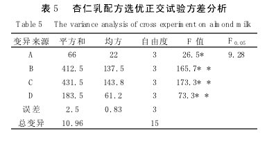 2.4 杏仁乳配方的正交試驗結(jié)果 通過方差分析(表5)可知,所試4個因素B、C、D為主要因素,差異極顯著;A為次要因素,差異不顯著;其對杏仁乳配方的影響次序為C→B→D→A。