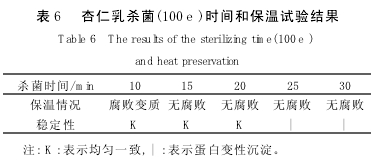 本組試驗所得杏仁乳的最佳配方組合為A2B2C2D1,即糖蜜素0.01 %,白砂糖3 %,海藻酸納 0.04 %,富安劑0.2 %。 2.5 杏仁乳殺菌工藝參數(shù)的確定 由表6可知,杏仁乳常壓殺菌(100℃)時間≥15min,能達到滅菌之目的,當殺菌時間25 min時,杏仁乳則產(chǎn)生蛋白變性,出現(xiàn)沉淀?紤]殺菌工藝的安全性,杏仁乳殺菌規(guī)程應選擇15′―20′―15′/100℃為宜。