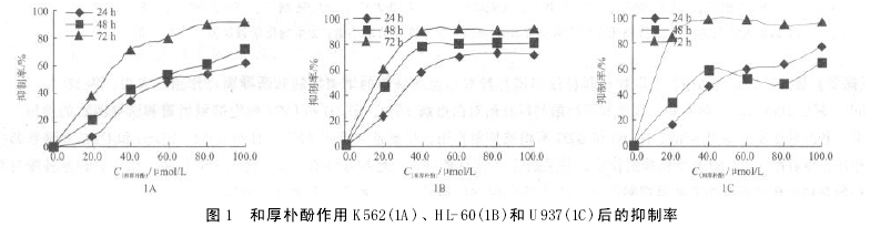 [摘要]目的:研究中藥厚樸提取物和厚樸酚與厚樸酚對白血病細胞的增殖抑制和誘導凋亡作用。方法:用MTT、AnnexinV、凋亡DNALadder等實驗,觀察和厚樸酚與厚樸酚對白血病K562、HL-60和U937細胞抑制增殖和誘導凋亡的作用。結(jié)果:和厚樸酚實驗組對K562、HL-60和U937有增殖抑制作用,呈劑量時間依賴性,且對K562、HL-60和U937有誘導凋亡 作用;厚樸酚對HL-60有增殖抑制作用,并呈劑量時間依賴性,但與和厚樸酚聯(lián)合用藥無協(xié)同作用。結(jié)論:和厚樸酚與厚樸酚對白血病細胞株均有增殖抑制作用,且呈劑量時間依賴性,但二者之間無聯(lián)合協(xié)同作用。 [關鍵詞]厚樸;和厚樸酚;厚樸酚;白血病細胞 隨著環(huán)境污染加重,白血病的患病率有上升趨勢。目前白血病臨床治療首選化療。但由于化療藥物的副作用和復發(fā)等問題,使得研發(fā)高效低毒的化療藥物迫在眉睫。研究發(fā)現(xiàn),中藥厚樸提取物和厚樸酚與厚樸酚有抗菌消炎,抗腫瘤等療效。K562細胞株是第一個被分離建立的髓系白血病細胞系,表達BcrAbl融合基因, HL-60是人類幼稚粒細胞白血病細胞系, U937細胞株能分泌大量細胞和趨化因子(IL-1和GM-CSF)等。本研究以白血病K562、HL-60和U937細胞株為研究對象,探討中藥厚樸提取物和厚樸酚與厚樸酚對白血病細胞增殖抑制和誘導凋亡作用,研究中藥抗腫瘤的物質(zhì)基礎和作用機制。 1 材料與方法 1·1 細胞培養(yǎng) K562、HL-60、U937于CO2培養(yǎng)箱中37℃、體積分數(shù)5%的CO2常規(guī)培養(yǎng), 2~3 d換液傳代一次。 1·2 MTT實驗 取各對數(shù)生長期培養(yǎng)細胞計數(shù),再分別取1mL細胞(1×105個細胞)于24孔培養(yǎng)板中。設計6 個系列濃度,即分別依次加入和厚樸酚(終濃度0·0、20·0、40·0、60·0、80·0、100·0μmol/L),置于37℃, CO2培養(yǎng)箱中。分別在24、48、72 h取100μL細胞于96孔細胞培養(yǎng)板,加MTT(上海凌峰化學試劑有限公司,中國。5 mg/mL)10μL混勻,37℃放置4 h。然后,各加異丙醇溶液(V(HCl)∶V(異丙醇)=17∶5 000)100μL,混勻,在Multiskan spectrum酶標儀(Thermo Labsystems公司,美國)570 nm進行檢測,計算并制作抑制率濃度曲線圖。 用同樣的MTT方法觀察厚樸酚終濃度為0·0、10·0、20·0、30·0、40·0、50·0μmol/L作用HL-60 24、48及72 h,以及和厚樸酚、厚樸酚各自終濃度為0·0、6·3、12·5、25·0、50·0、100·0μmol/L聯(lián)合作用HL-60 24、48和72 h,觀察和厚樸酚與厚樸酚之間有無協(xié)同作用。 1·3 DNALadder分析 各取已加和厚樸酚20·0、40·0μmol/L的K562、HL60、U937細胞液適量(1×105個細胞),在37℃, CO2培養(yǎng)箱中培養(yǎng)24 h后,用DNA Ladder提取試劑盒(普利來基因有限公司,中國)提取細胞DNA進行電泳分析,當細胞發(fā)生凋亡時電泳圖譜出現(xiàn)DNA條帶。 1·4 流式細胞術分析 分別在上述K562、HL60、U937加入和厚樸酚終濃度為0·0、20·0、40·0μmol/L培養(yǎng)24 h后,取適量細胞用FITCAnnexinV/PI雙染,進行流式細胞術分析。 1·5 聯(lián)合用藥的聯(lián)合指數(shù)分析 用ChouTalalay公式計算兩藥聯(lián)合作用白血病細胞的聯(lián)合指數(shù)CI(CI=1疊加效應, CI<1協(xié)同,CI>1拮抗)。 1·6 統(tǒng)計學處理 用統(tǒng)計軟件SPSS13·0對數(shù)據(jù)進行統(tǒng)計學分析。 2 結(jié)果 2·1 和厚樸酚對白血病細胞MTT實驗結(jié)果(圖1) 利用MTT實驗分別觀察和厚樸酚對K562、HL-60和U937增殖抑制作用,結(jié)果發(fā)現(xiàn)和厚樸酚對其均有增殖抑制作用,且呈劑量時間依賴。