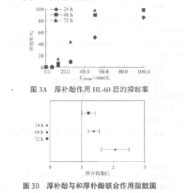 2·4 厚樸酚及厚樸酚、和厚樸酚聯(lián)合作用對HL-60的MTT實驗結(jié)果(圖3) 利用HL-60首先觀察厚樸的另一種提取化合物厚樸酚對白血病細胞的增殖抑制作用,并通過統(tǒng)計學方法觀察厚樸酚、和厚樸酚聯(lián)合作用的效果。結(jié)果發(fā)現(xiàn)厚樸酚對HL-60也存在增殖抑制作用,但與和厚樸酚之間無聯(lián)合協(xié)同作用,聯(lián)合指數(shù)CI>1。 3 討論 厚樸主要用于治療胃腸功能紊亂,其干燥皮可提取活性藥用成分和厚樸酚及厚樸酚。近年發(fā)現(xiàn)和厚樸酚具有明顯的抗腫瘤活性,可明顯抑制卵巢癌、乳腺癌等多種實體腫瘤增殖作用。中醫(yī)藥臨床多用原藥,原藥厚樸中除含有和厚樸酚,還富含厚樸酚等天然活性化合物,因此我們利用MTT實驗觀察和厚樸酚與厚樸酚對三種白血病的增殖抑制和誘導凋亡作用。凋亡的顯著特征是細胞內(nèi)出現(xiàn)凋亡小體。是由染色體DNA斷裂所致。斷裂后形成了許多長約180 bp倍數(shù)的DNA片斷,通過電泳照相顯示為階梯狀,成為凋亡DNA Ladder,是細胞凋亡經(jīng)典實驗。DNALadder電泳實驗結(jié)果顯示和厚樸酚對三種白血病細胞有誘導凋亡作用。細胞早凋亡時,位于細胞膜內(nèi)側(cè)的PS可遷移至外側(cè),形成膜反轉(zhuǎn)。標記上熒光素的磷脂酰結(jié)合蛋白V(Annexin V)對PS有高度的親合力。圖2顯示當0·0、20·0、40·0μmol/L和厚樸酚分別作用于K562、HL-60、U937 24 h后,通過流式細胞儀檢測到AnnexinV-FITC陽性細胞,顯示和厚樸酚作用白血病細胞后發(fā)生PS膜反轉(zhuǎn),出現(xiàn)早期凋亡細胞,且凋亡細胞數(shù)量具有劑量依賴性。 圖3A提示厚樸酚作用HL-60后其抑制率與和厚樸酚接近。說明和厚樸酚與厚樸酚活性化合物是抗腫瘤的物質(zhì)基礎。圖3B為和厚樸酚與厚樸酚聯(lián)合作用時通過統(tǒng)計學計算得到的聯(lián)合指數(shù),當聯(lián)合厚樸酚對白血病細胞的增殖抑制作用,并通過統(tǒng)計學方法觀察厚樸酚、和厚樸酚聯(lián)合作用的效果。結(jié)果發(fā)現(xiàn)厚樸酚對HL-60也存在增殖抑制作用,但與和厚樸酚之間無聯(lián)合協(xié)同作用,聯(lián)合指數(shù)CI>1。 3 討論 厚樸主要用于治療胃腸功能紊亂,其干燥皮可提取活性藥用成分和厚樸酚及厚樸酚。近年發(fā)現(xiàn)和厚樸酚具有明顯的抗腫瘤活性,可明顯抑制卵巢癌、乳腺癌等多種實體腫瘤增殖作用。中醫(yī)藥臨床多用原藥,原藥厚樸中除含有和厚樸酚,還富含厚樸酚等天然活性化合物,因此我們利用MTT實驗觀察和厚樸酚與厚樸酚對三種白血病的增殖抑制和誘導凋亡作用。凋亡的顯著特征是細胞內(nèi)出現(xiàn)凋亡小體。是由染色體DNA斷裂所致。斷裂后形成了許多長約180 bp倍數(shù)的DNA片斷,通過電泳照相顯示為階梯狀,成為凋亡DNA Ladder,是細胞凋亡經(jīng)典實驗。DNALadder電泳實驗結(jié)果顯示和厚樸酚對三種白血病細胞有誘導凋亡作用。 細胞早期凋亡時,位于細胞膜內(nèi)側(cè)的PS可遷移至外側(cè),形成膜反轉(zhuǎn)。標記上熒光素的磷脂酰結(jié)合蛋白V(Annexin V)對PS有高度的親合力。圖2顯示當0·0、20·0、40·0μmol/L和厚樸酚分別作用于K562、HL-60、U937 24 h后,通過流式細胞儀檢測到AnnexinVFITC陽性細胞,顯示和厚樸酚作用白血病細胞后發(fā)生PS膜反轉(zhuǎn),出現(xiàn)早期凋亡細胞,且凋亡細胞數(shù)量具有劑量依賴性。 圖3A提示厚樸酚作用HL-60后其抑制率與和厚樸酚接近。說明和厚樸酚與厚樸酚活性化合物是抗腫瘤的物質(zhì)基礎。圖3B為和厚樸酚與厚樸酚聯(lián)合作用時通過統(tǒng)計學計算得到的聯(lián)合指數(shù),當聯(lián)合指數(shù)CI<1時表示二者有聯(lián)合作用。和厚樸酚與厚樸酚聯(lián)合作用HL-60在不同時間段聯(lián)合指數(shù)CI>1,提示二者對HL-60無聯(lián)合協(xié)同作用。綜上所述,和厚樸酚與厚樸酚分別具有抑制K562、HL-60和U937增殖抑制或誘導凋亡作用,和厚樸酚與厚樸酚對HL-60的增殖抑制無協(xié)同聯(lián)合作用,其結(jié)果為研發(fā)新的抗白血病治療藥物和厚樸的新用途提供了實驗依據(jù)。 |