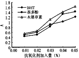 圖2 還原能力比較 花生殼提取物木犀草素具有供氫能力,H 與自由基結(jié)合,使之 還原為惰性化合物或穩(wěn)定自由基,從而可清除機(jī)體內(nèi)過多有害自由基。羥自由基是毒性最大活性氧,對(duì)細(xì) 胞內(nèi)DNA破壞作用最大 ,活性氧所導(dǎo)致DNA損 傷在細(xì)胞里積累被認(rèn)為是機(jī)體老化主要原因 。黃酮 B環(huán)鄰二酚羥基(3’,4’一鄰二羥基)存在極大增強(qiáng)其抗氧化活性,可認(rèn)為這是黃酮類高效抗氧化劑結(jié)構(gòu)基 礎(chǔ)¨ 。而花生殼提取物木犀草素結(jié)構(gòu)為3’,4’,5,7-四羥基黃酮,因此其B環(huán)鄰二酚羥基是清除羥自由基的關(guān)鍵功能 團(tuán)。從圖1、圖2可看出,隨著添加量增加,清除率和 還原能力都在增強(qiáng)。當(dāng)花生殼提取物木犀草素加入量為0.05%時(shí), 對(duì)羥自由基清除率達(dá)96.02%,明顯高于BHT,比茶 多酚略好。 2.3花生殼提取物木犀草素抑菌曲線測(cè)定結(jié)果