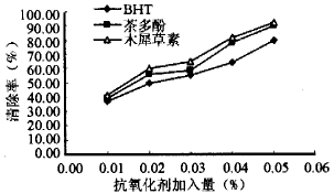 由表1列示花生殼提取物木犀草素和BHT以三個(gè)添加水平加入 豬油中采用快速測(cè)定法試驗(yàn)結(jié)果,由表1可見,木犀草紊具有良好抗脂質(zhì)氧化能力,其最適添加量為0.02%左右。 2.2花生殼提取物木犀草素還原能力和清除·OH能力 花生殼提取物木犀草素清除·OH能力測(cè)定結(jié)果如圖l所示。