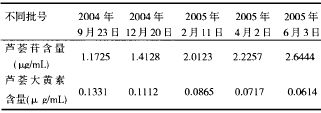 分析不同批號蘆薈汁中蘆薈苷、蘆薈大黃素的含 量可知,隨著蘆薈汁的保存時間的增加,蘆薈苷的含 量不斷減少,而蘆薈大黃素的含量相應(yīng)的不斷增加, 原因在于:蘆薈原汁長久放置,其中蘆薈苷被氧化分 解,一部分變成了蘆薈大黃素,所以導致了以上結(jié)果。