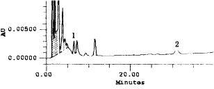 圖1蘆薈汁色譜分離圖 1:蘆薈苷2:蘆薈大黃素 2 結(jié)果與討論 2.1 檢測波長的選擇 作者采用以甲醇為溶劑,對蘆薈苷、蘆薈大黃素進行紫外一可見掃描,蘆薈苷在225,269,298, 359nm有吸收峰,蘆薈大黃素在225,254,436nm處有 吸收峰,其中均以225nm吸收值最高,因此建立了一 種同時測定蘆薈樣品中蘆薈苷和蘆薈大黃素的高效 液相色譜分析方法,即把檢測波長定在225nm處可 以同時測定蘆薈苷和蘆薈大黃素的含量。 2.2 方法精密度實驗 取某一濃度對照品,測其吸收面積(進標樣 l0 ,n=6),計算精密度,結(jié)果蘆薈苷RSD為1.24%, 蘆薈大黃素RSD為1.05% 2.3對照品穩(wěn)定性實驗 把對照品放在冰箱中存放(4cIC),分別在0、2、 4、8、12、24h測同一濃度樣品的吸收面積(進標樣l0 L,n=6),蘆薈苷峰面積的RSD為1.9l%,蘆薈大黃 素峰面積的RSD為1.76%,表明對照品溶液在24h內(nèi) 基本穩(wěn)定。 2.4 加標回收率實驗 在已測得蘆薈苷、蘆薈大黃素含量的蘆薈汁樣品 中加入一定量的蘆薈苷和蘆薈大黃素標品,按照測定 方法,測其吸收面積,換算成質(zhì)量,并進行回收率計 算。蘆薈苷:平均回收率為101.13%,RSD為1.39%。 蘆薈大黃素:平均回收率為100.05%,RSD為1.28%。 2.5 方法重復性實驗 對同一批號的蘆薈汁平行測定6次,測其吸收面 積,得其相對標準偏差,蘆薈苷:1.13%蘆薈大黃素: 1.18%。表明此方法能夠重復操作。 2.6 樣品測定結(jié)果與分析 對不同生產(chǎn)日期(批號)的蘆薈汁進行蘆薈苷和 蘆薈大黃素含量的測定,結(jié)果列于表1: 表1不同批號蘆薈汁中蘆薈苷和蘆薈大黃素的測定結(jié)果(n=3)