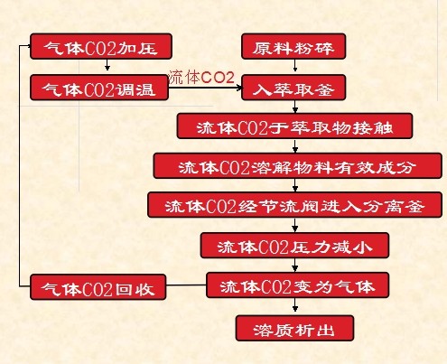 每種物質(zhì)都有三種狀態(tài):即氣態(tài)、液態(tài)和固態(tài),在一定溫度、壓力條件下,三種狀態(tài)共存達(dá)到平衡,這時的溫度、壓力條件叫三相點(diǎn)。當(dāng)只有氣體和液體共存并達(dá)到平衡時,這時的溫度壓力條件叫做臨界點(diǎn),外界條件超過臨界壓力和溫度時,物質(zhì)即處于超臨界狀態(tài)。 物質(zhì)處于其臨界溫度和臨界壓力以上的狀態(tài)時,向該狀態(tài)氣體加壓,氣體不會液化,只是密度增大,具有類似液態(tài)性質(zhì),同時還保留氣體性能,這種狀態(tài)的流體為超臨界流體。超臨界狀態(tài)CO2流體,具有像液體一樣的流動性和像氣體一樣的擴(kuò)散性,并具有很強(qiáng)的溶解性,用超臨界狀態(tài)CO2的這種溶解性來分離物質(zhì)(非極性或弱極性)的方法叫超臨界CO2萃取。